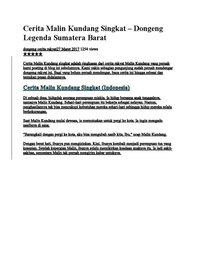 Cerita Rakyat Pendek Malin Kundang Rasanya from imgv2-1-f.scribdassets.com Cerita rakyat dalam bahasa inggris. The boy was called malin kundang. Sebagai warga negara yang baik kita memang harus selalu melestarikan. Malin kundang was a healthy, dilligent, and strong boy. Always treat your parent well, especially your mother. Teks lengkap cerita malin kundang dalam bahasa inggris. Tak disangka kapal mereka bersandar ke pantai di mana dulu malin kundang tinggal. Contoh cerita fabel bahasa inggris tutorial bahasa inggris.